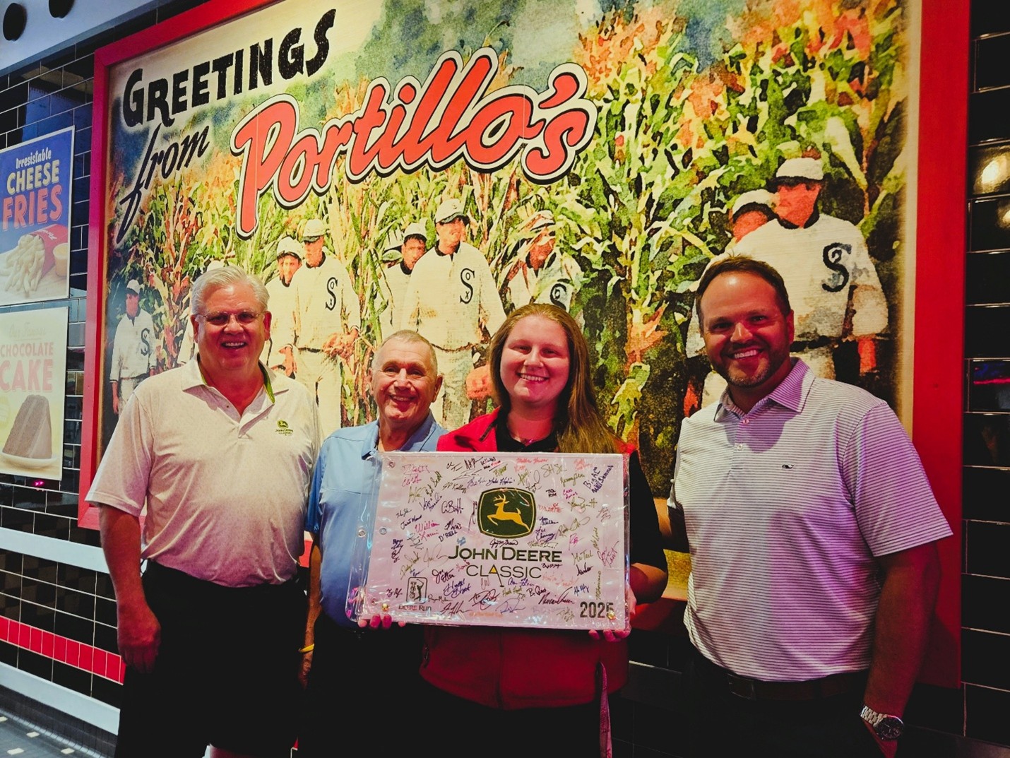 On August 4th, Ron Keener (left), Caddie Concierge, Butch Peiffer (left center), Caddie Lounge Chair and Andrew Lehman (right), Tournament Director made the presentation of the 2025 Caddie “Most Valuable Sponsor” flag to Nicole Hoskins, General Manager of Portillos Hot Dogs.